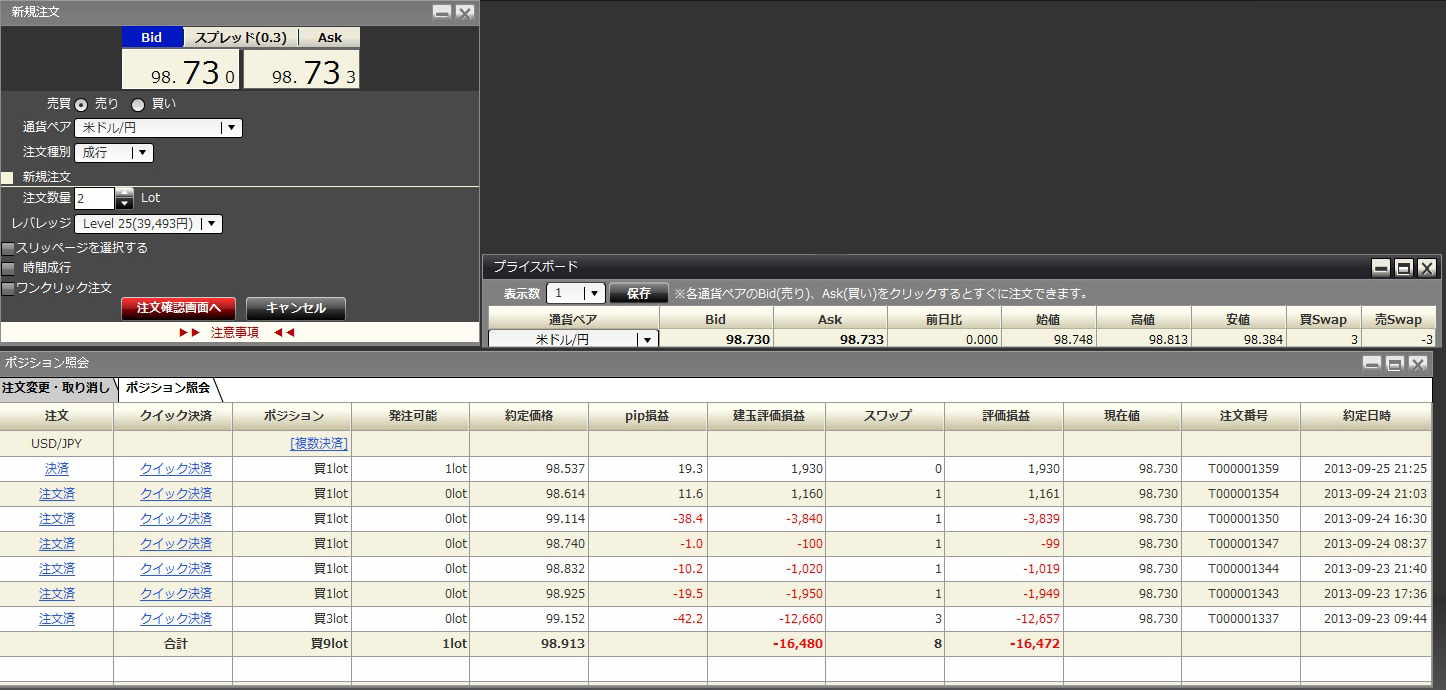 | USD/JPY | 新規 | 買 | 1 | 98.925 | 2013/9/23 17:36 | 9/23 持越分 |